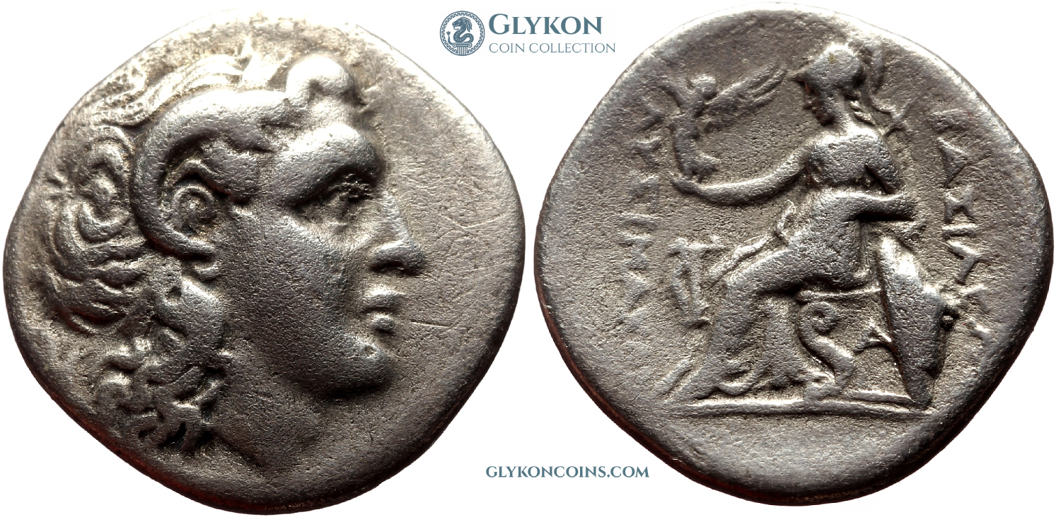 Obverse: Head of the deified Alexander facing right, diademed and adorned with bull horns (horns of Ammon). Reverse: Seated Athena Nikephoros ("Athena Bringer of Victory") facing left, resting on shield and holding winged Nike, spear behind. Monogram ΠA on left, torch on right. Legend: BAΣIΛEΩΣ ΛYΣIMAXOY (of king Lysimachus). |