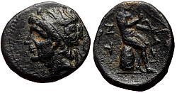 Obverse: Head of Kabeiros (enigmatic Aegean deity), beardless and wearing pilos (conical hat), facing left. Two stars flanking pilos. Reverse: Within a laurel wreath B-I/P-Y around a club pointed downwards. |