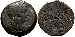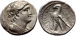 Obverse: Head of Antiochus Antiochus VIII Grypus to right, in radiate crown. Reverse: Eagle standing to left, spear behind. Legend: BAΣIΛEΩΣ ANTIOXOY EΠΙΦΑΝOY (of king Antiochus, god manifest). |