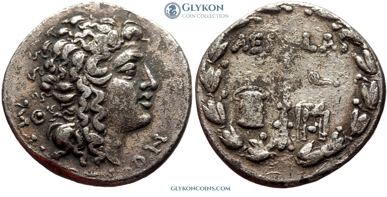 Obverse: Within ivy wreath with berries Cista mystica (ritual basket with snakes) with half open lid, snake emerges on left. Reverse: Two entagled snakes with erected heads flanking a bow-case. Monograms above and left.