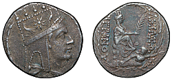 Reverse: Draped and crowned Tyche of Artaxata, seated facing right on a throne made of rocks, holding a palm branch in an outstretched right hand. River god Araxes swimming towards right at her feet. Monogram Σ and Ω. Legend: ΒΑΣΙΛΕΩΣ ΤΙΓΡΑΝΟΥ (of King Tigranes).