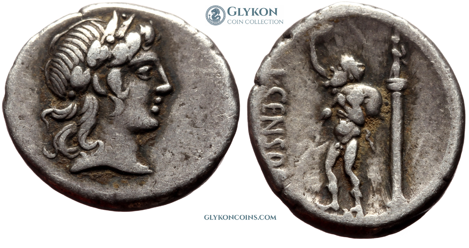 Obverse: Laureate head of Apollo to right. Wreath behind. Reverse: Nude satyr Marsyas standing to right gazing upwards, holding wineskin and raising right hand. On right a column surmonted by a statue of a deity with hands folded as for prayer. Legend: L·CENSOR.