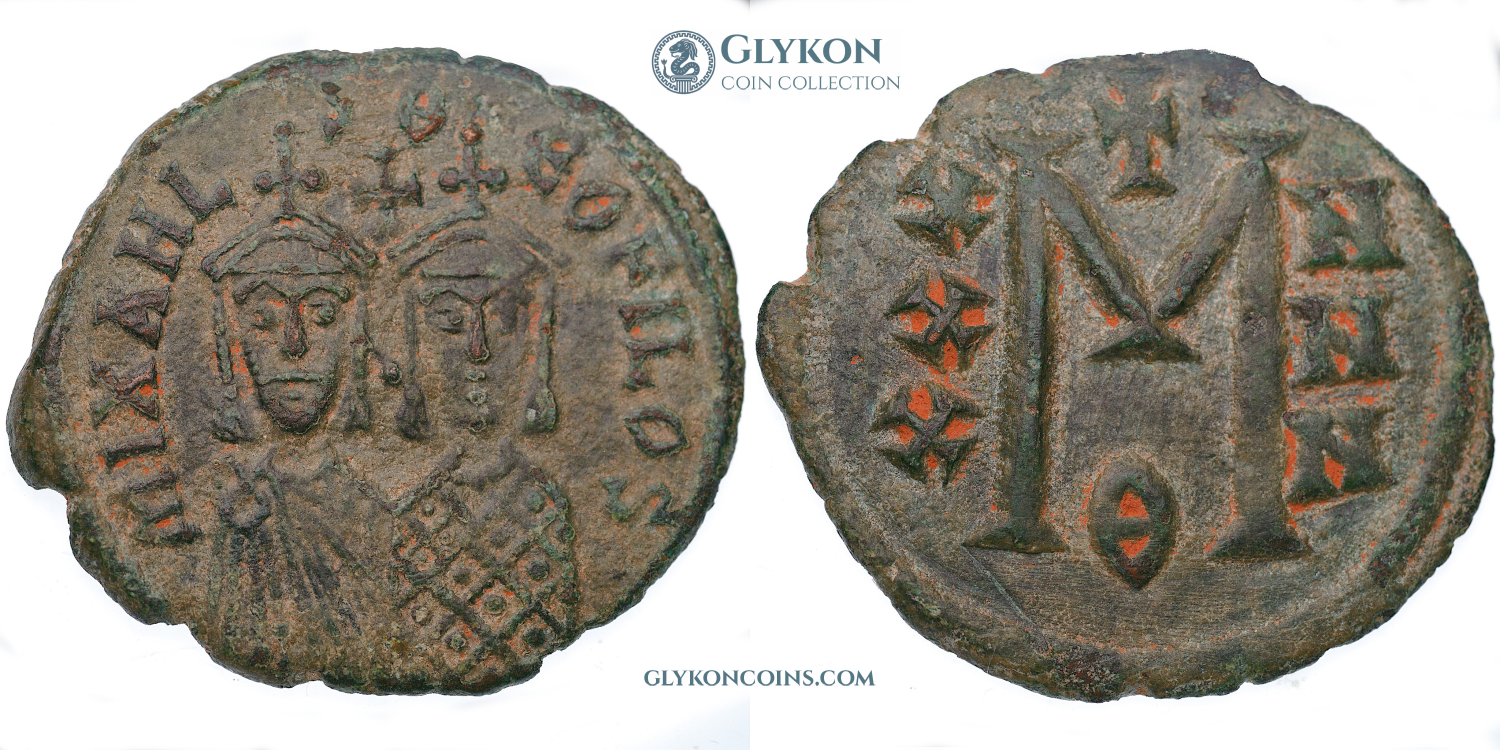 Obverse: Facing busts of bearded Heraclius on the left and beardless Heraclius Constantine on the right, each crowned and wearing chlamys. Legend: dd mm h hERAC Reverse: Large I and B indicating denomination of 12 nummi. Between them large cross potent on two steps. ΑΛЄƵ below in exergue.