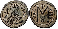 Comment: Sicilian folles were unaffected by Theophilus' reform and continued to be minted with large M until the fall of Syracuse in 878. After that, although small Byzantine rump territories survived on the island for several more decades, coin production ceased and no further Byzantine issues were minted in Sicily. |