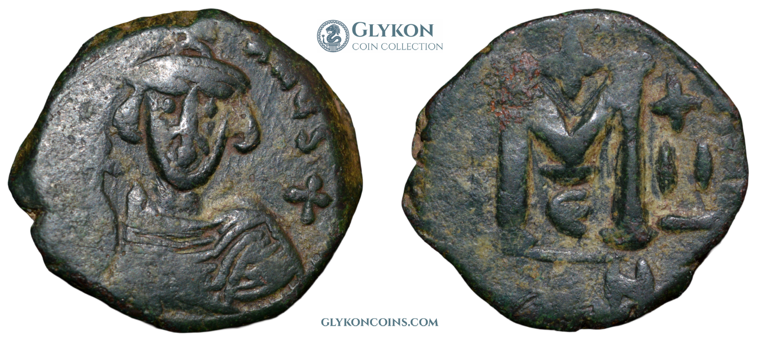 Obverse: Facing bust of youthful Justinian II, wearing crucigerous crown and chlamys, holding globus cruciger. Legend: IЧSTINIANЧS+ Reverse: Large M indicating denomination with a cross above, officina symbol Є below. CON in exergue. On the right regnal year II between a cross above and a dash below.