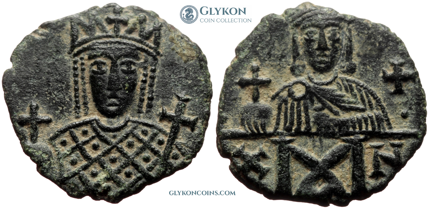 Obverse: Two crowned figures standing facing: Constans II, bearded and armored, holding a long cross; and his son Constantine (later Constantine IV), beardless and in chlamys, holding a globus cruciger. No legend. Reverse: Large M indicating denomination of 40 nummi. Monogram above, SCL below. Standing facing figures of Constans' younger sons, each crowned, wearing chlamys and holding globus cruciger: Heraclius on the left and Tiberius on the right.