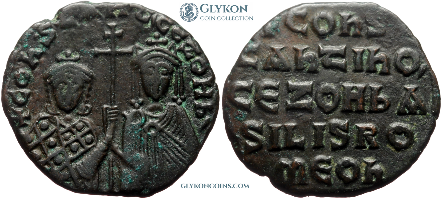 Reverse: Legend in five lines: +COnS / tAntInO' / CЄ ZOH bA /SILIS RO / mЄOn (Constantine and Zoe, in God, Emperors of the Romans). |