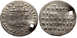 Obverse: Facing busts of young crowned Constantine wearing loros and crowned regent empress-mother Zoe wearing chlamys, both holding together a large patriarchal cross between them. Legend: +COnStAnt' CЄ ZOH b'