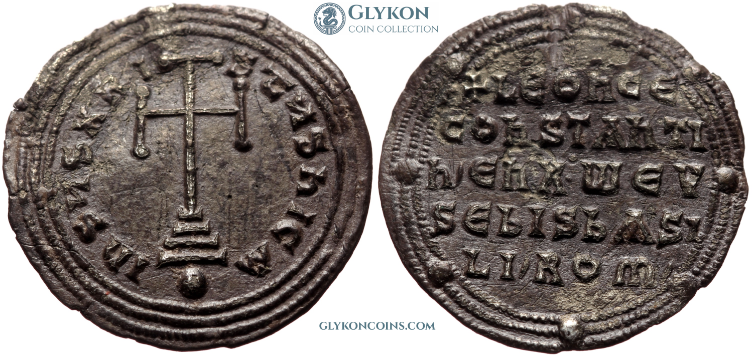 Obverse: Facing bust of bearded Leo, wearing loros and crucigerous crown, holding large cross potent in the right hand. Legend: ΛЄOn*