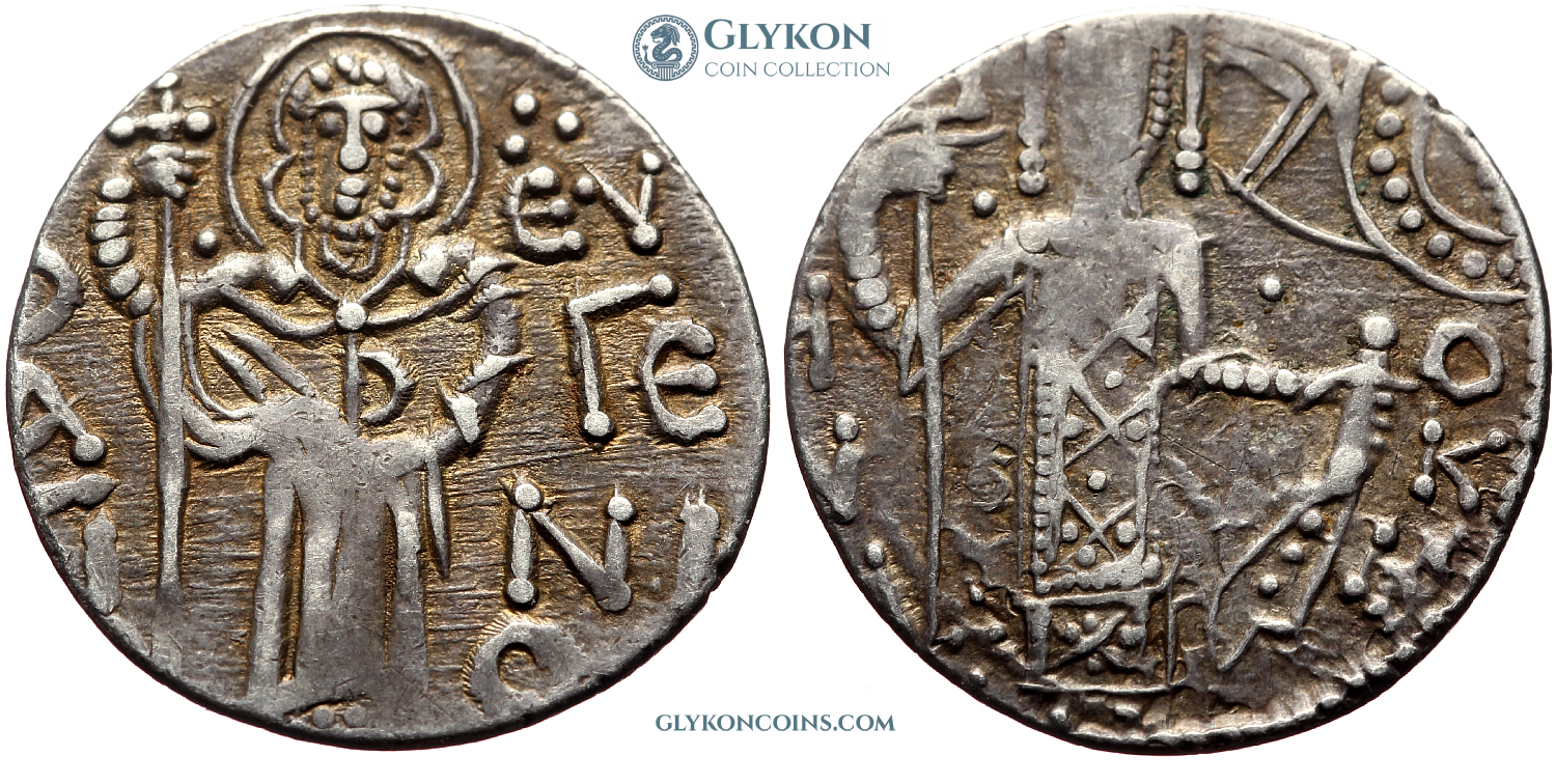 Obverse: Facing bust of Christ with nimbate (that is, haloed) cross behind head, holding a dotted book of gospels. Legend: IC-XC (monogram of Christ). Reverse: Facing bust of John, crowned, wearing divitision and loros, holding sceptre cruciger in right hand and globus cruciger in left hand. Legend: ΙΩ ΔЄϹΠΟΤ Τ ΠΟΥΠΟΓΝΤ (Ioannes Despotes ho Porphyrogennetos - John, emperor, the purple-born). |