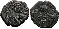 Obverse: Enthroned Christ with nimbate (that is, haloed) cross behind head, holding a book of gospels and raising His right hand. Legend: IC-XC (monogram of Christ) with lines above. Reverse: Legend in six lines: -+- / ΘKЄRΘ / MIXAHΛ / ΔЄϹΠΟΤH. / Tω ΔOV KA / -*-